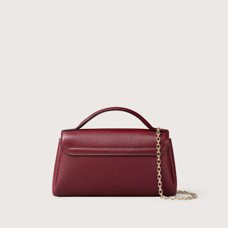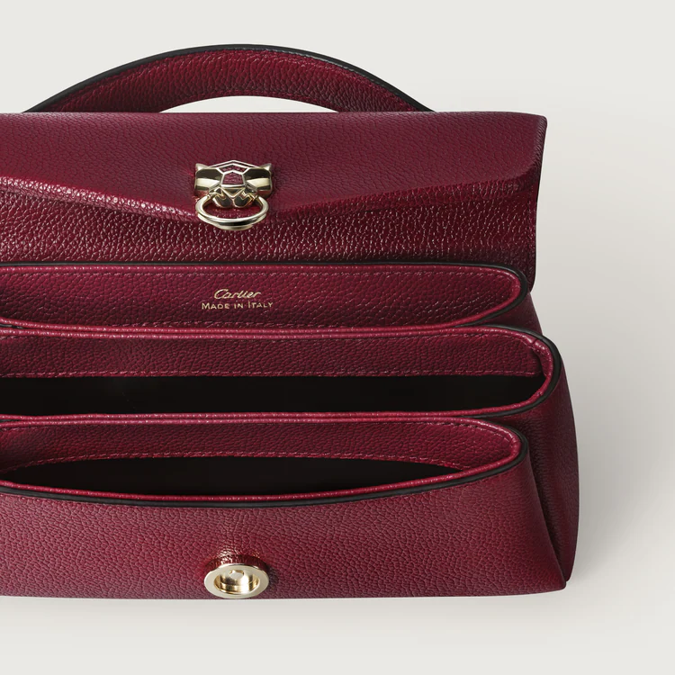 Сумка Panthère Graphique de Cartier nano моделі на ланцюжку з бордової зернистої телячої шкіри, застібка із золотистим покриттям, золотий підпис «Cartier» гарячого тиснення всередині. Три внутрішні відділення, одна плоска кишеня. Підкладка: чорна овчина. Знімний ланцюжок. Розміри: висота 120 мм x довжина 200 мм x глибина 40 мм. Носіння на плечі та через плече.