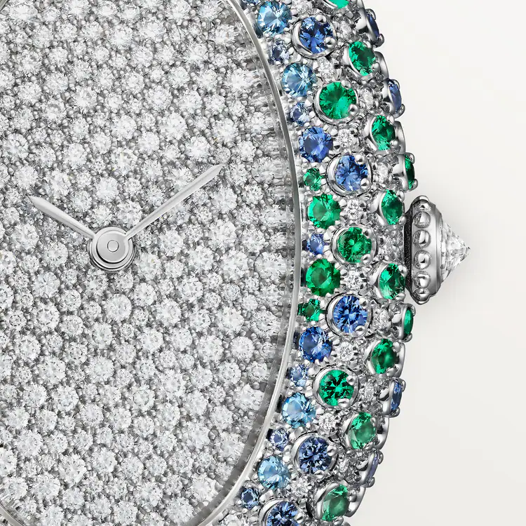 Годинник Baignoire, середня модель, кварцовий механізм. Корпус з 18-каратного білого золота (750/1000), інкрустований 16 аквамаринами, 58 сапфірами загальною вагою 0,75 карата, 54 смарагдами загальною вагою 0,62 карата та 170 діамантами блискучого огранювання загальною вагою 0,95 карата. Заводна головка з 18-каратного білого золота (750/1000) з родієвим покриттям, інкрустована бісером та діамантом блискучого огранювання загальною вагою 0,14 карата. Циферблат інкрустований 262 діамантами загальною вагою 1,07 карата, сталеві стрілки у формі меча з родієвим покриттям, сапфірове скло. Синій ремінець зі шкіри алігатора, пряжка Ardillon з білого золота 18 карат (750/1000) з родієвим покриттям, інкрустована 21 діамантом загальною вагою 0,21 карата. Довжина: 36 мм, ширина: 26 мм, товщина: 8,5 мм. Водонепроникність до 3 бар (приблизно 30 метрів/100 футів).