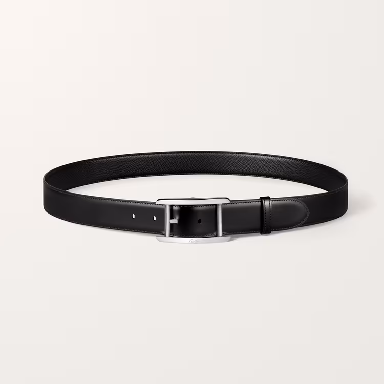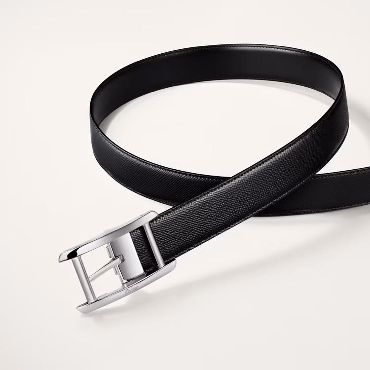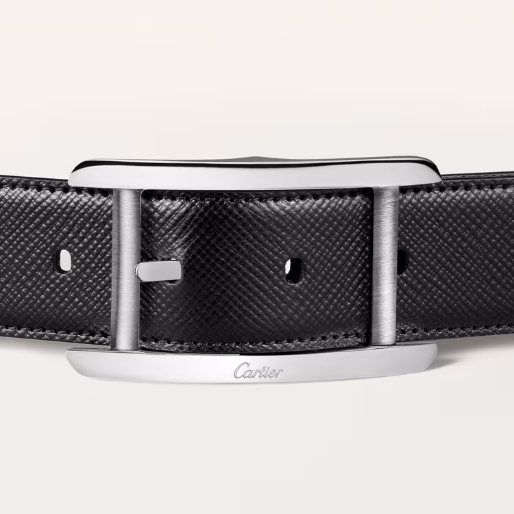 Ремінь із застібкою Ardillon з паладієвим покриттям, фірмовий знак Cartier. Двосторонній ремінець з текстурованої та гладкої коров'ячої шкіри, тиснений лозунг Cartier. Розміри: 35 мм завширшки x 1,230 мм завдовжки. Регульований.