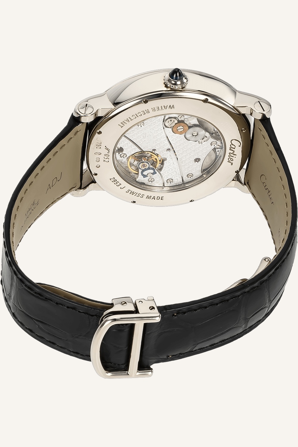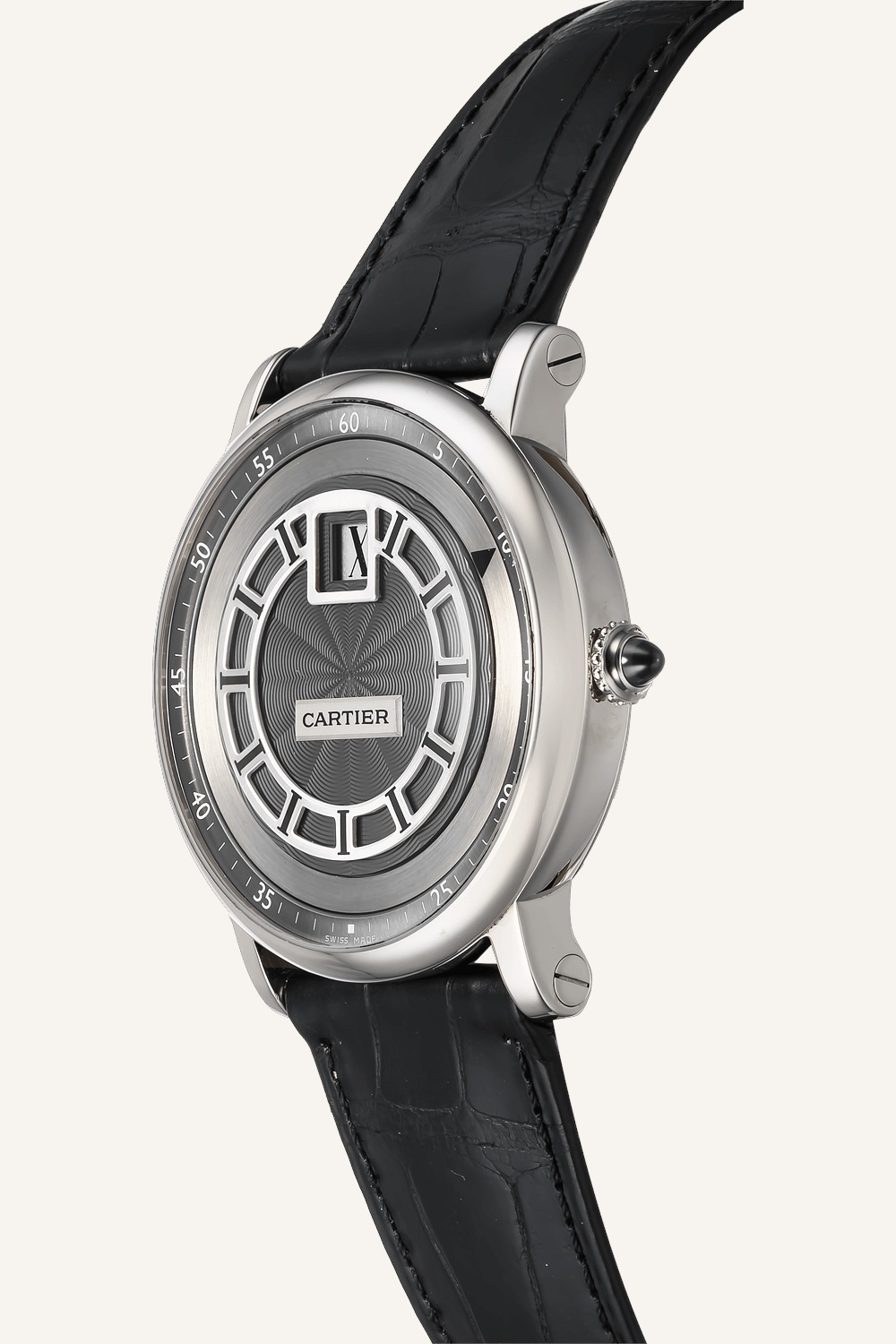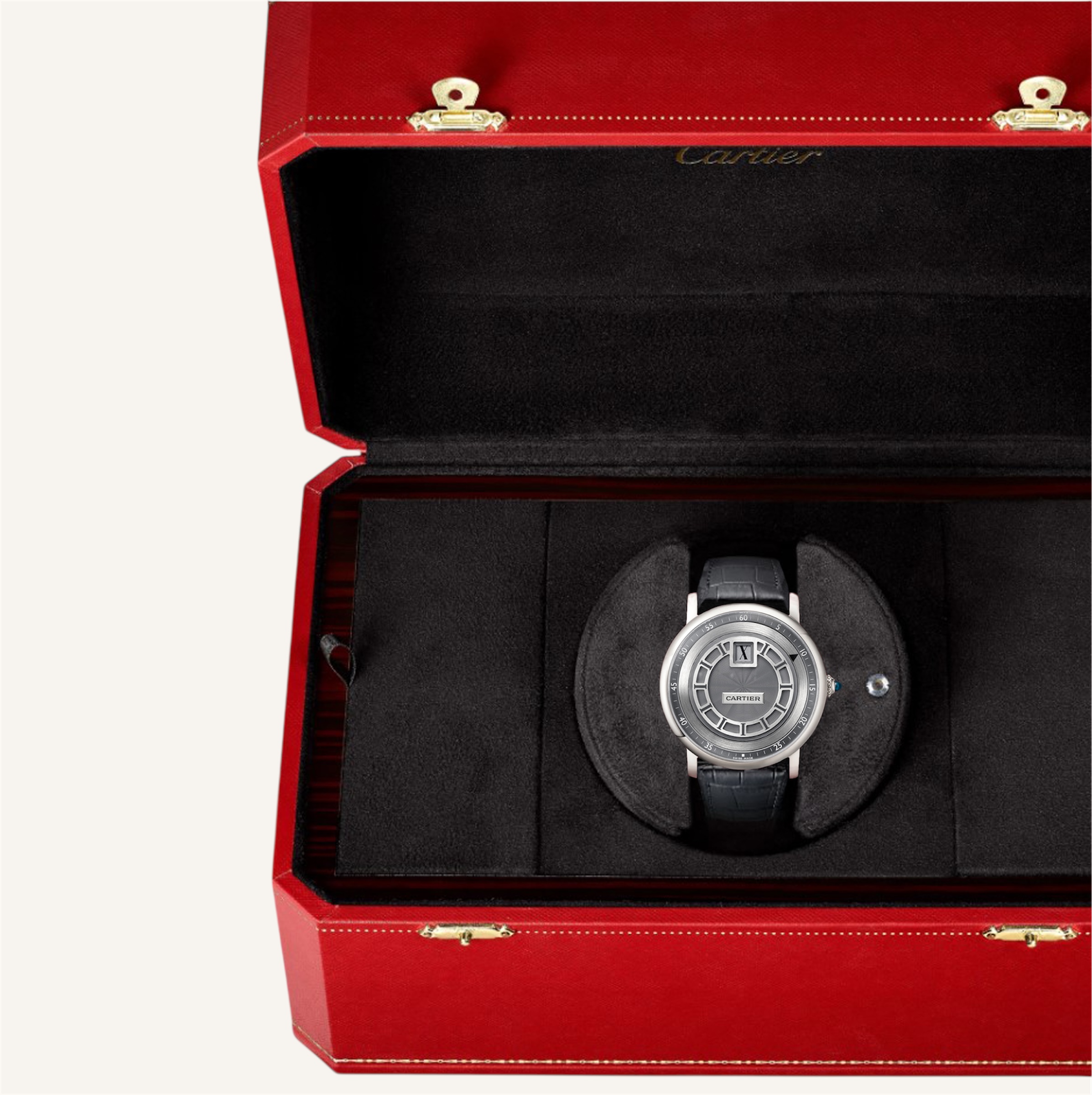Округлий корпус з благородного металу доповнюється заводною головкою з сапфіровим кабошоном — знаковою деталлю стилю Cartier. Усередині годинника працює мануфактурний механізм, створений для забезпечення точності та надійності складної функції миттєвої зміни години.