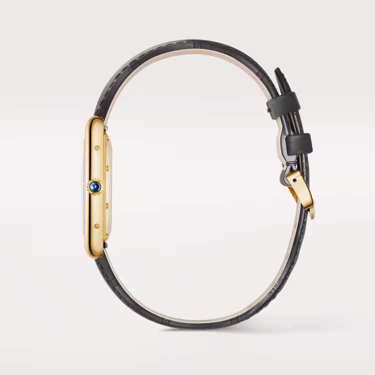 Годинник Tank Louis Cartier, велика модель, механічний механізм з автоматичним заводом, калібр 1899 MC. Корпус з 18-каратного жовтого золота (750/1000). Розміри: 38,1 x 27,75 мм, товщина: 8,18 мм. Штампований посріблений циферблат з жовтим лаком. Заводна головка з 18-каратного жовтого золота (750/1000) з бісером та сапфіровим кабошоном. Стрілки у формі меча з ворона. Напівматовий сірий ремінець зі шкіри алігатора. Водонепроникність до 3 бар (приблизно 30 метрів/100 футів).